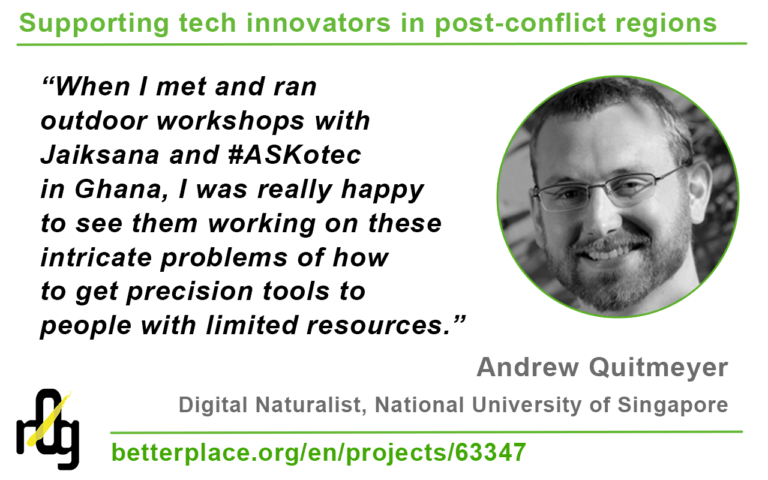 Meet one of #ASKotec‘s supporters, Andrew Quitmeyer. Andrew studies the intersections between wild animals and computational devices. He’s a professor at the National University of Singapore researching how to blend biological fieldwork and DIY digital crafting. Andrew also leads “Hiking Hacks” around the world where participants build technology entirely in the wild for interacting with nature…