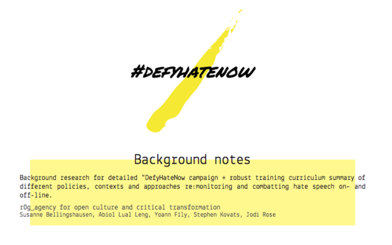 Background research for detailed “DefyHateNow campaign + robust training curriculum summary of different policies, contexts and approaches re:monitoring and combatting hate speech on- and off-line. r0g_agency for open culture and critical transformation Susanne Bellingshausen, Abiol Lual Leng, Yoann Fily, Stephen Kovats, Jodi Rose #DefyHateNow is an initiative to combat social media hate speech by…