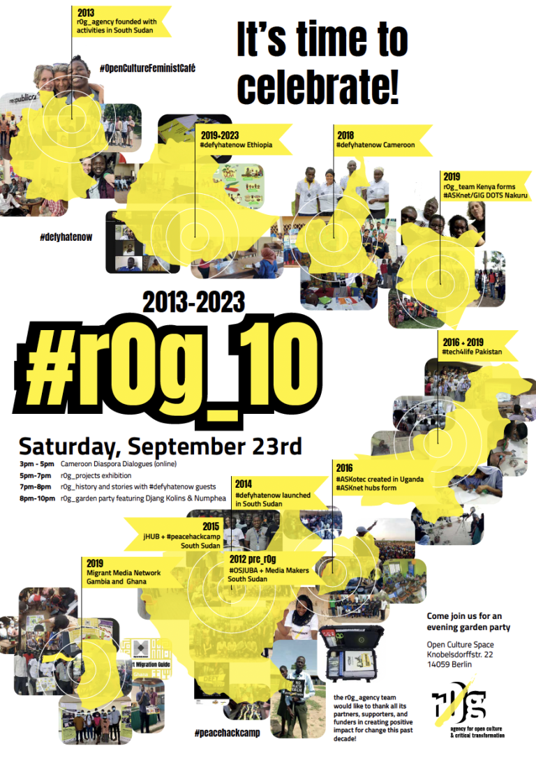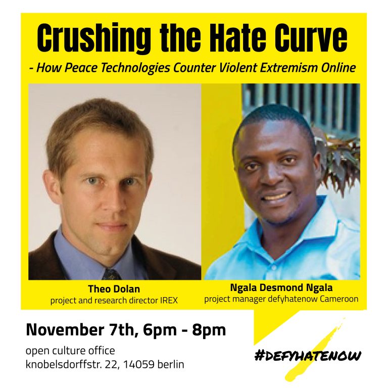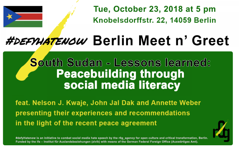 Time: Monday, November 7th, 6pm – 8pmLocation: r0g_agency OPEN CULTURE office Knobelsdorffstr. 22 14059 Berlin r0g_agency’s #defyhatenow initiative to counter social media hate speech and online incitement to violence was born in reaction to the sudden explosion of violent conflict in South Sudan at the end of 2013. When the relationship between social media and…