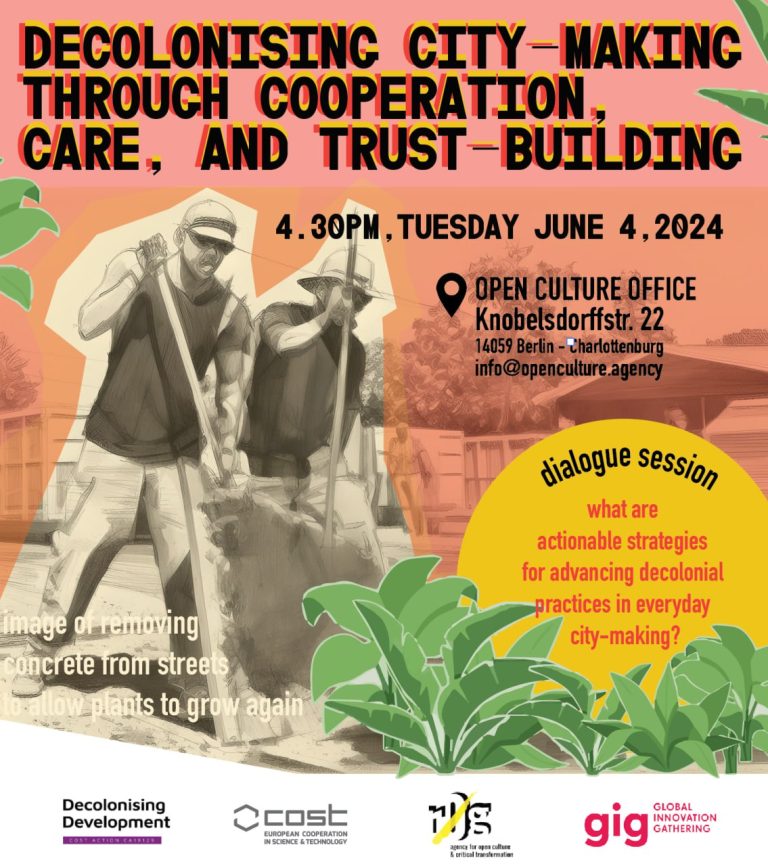 Hallo Berlin! Join us for a “roda de conversa” (a round-table-like format) where we’ll explore methods for decolonising city-making through cooperation, care, and trust-building. Let’s discuss actionable strategies for advancing decolonial practices and research in everyday city-making! When: June 4th, 16:30Where: OPEN CULTURE OFFICE, Knobelsdorffstr. 2214059 Berlin – CharlottenburgHow to join: Just come over!For more…