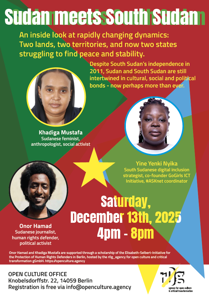 We look forward to welcoming you on Saturday, December 13th at 4pm at the OPEN CULTURE OFFICE Knobelsdorffstraße 22, 14059 Berlin-Charlottenburg for this special get-together. The event will take place primarily in English with Arabic and German translation as required and featuring wonderful Sudanese treats. Entry is free, but we ask you to register via info@openculture.agency in advance as space is limited!